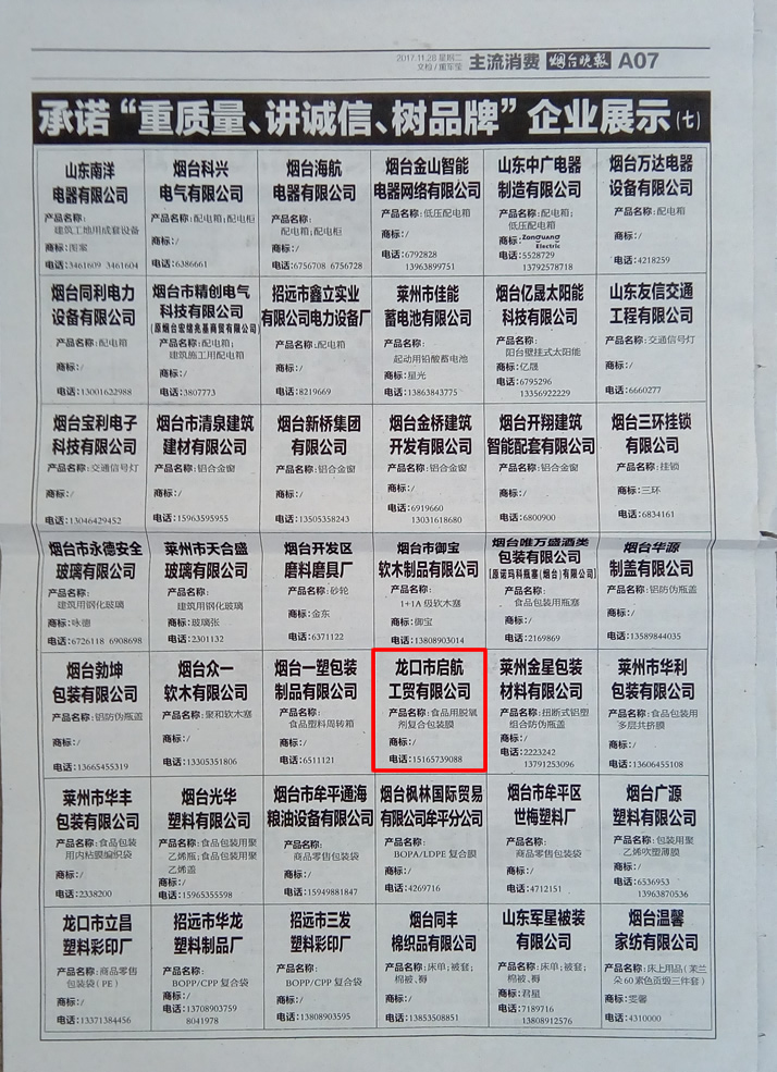 龍口市啟航工貿(mào)有限公司榮獲煙臺(tái)舉辦的承諾“重質(zhì)量、講誠信、樹品牌”企業(yè)。